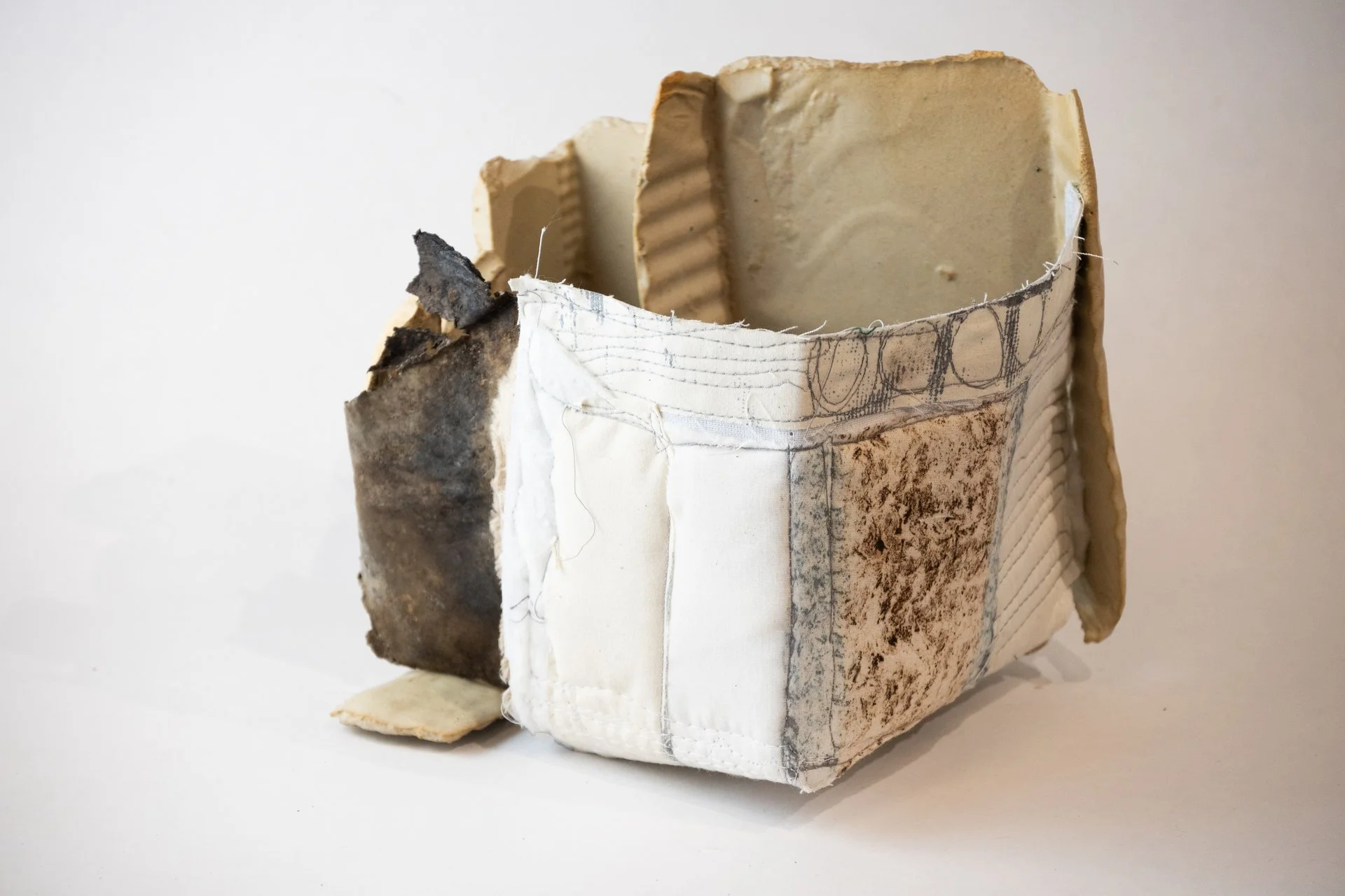 Ceramic, Discarded Metal, Quilted Prints on Fabric