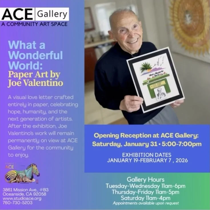 Joe Valentino is a celebrated San Marcos–based artist known for his vibrant, imaginative paper art that has captivated audiences for decades. His work was featured on CBS Sunday Morning, where his sun-inspired pieces were selected from thousands of submissions and showcased on national television — a recognition he still treasures. Valentino’s art combines intricately cut paper with paint, each piece assembled by hand with joy, optimism, and a distinctive creative voice rooted in fantasy and warmth. (CBS 8)